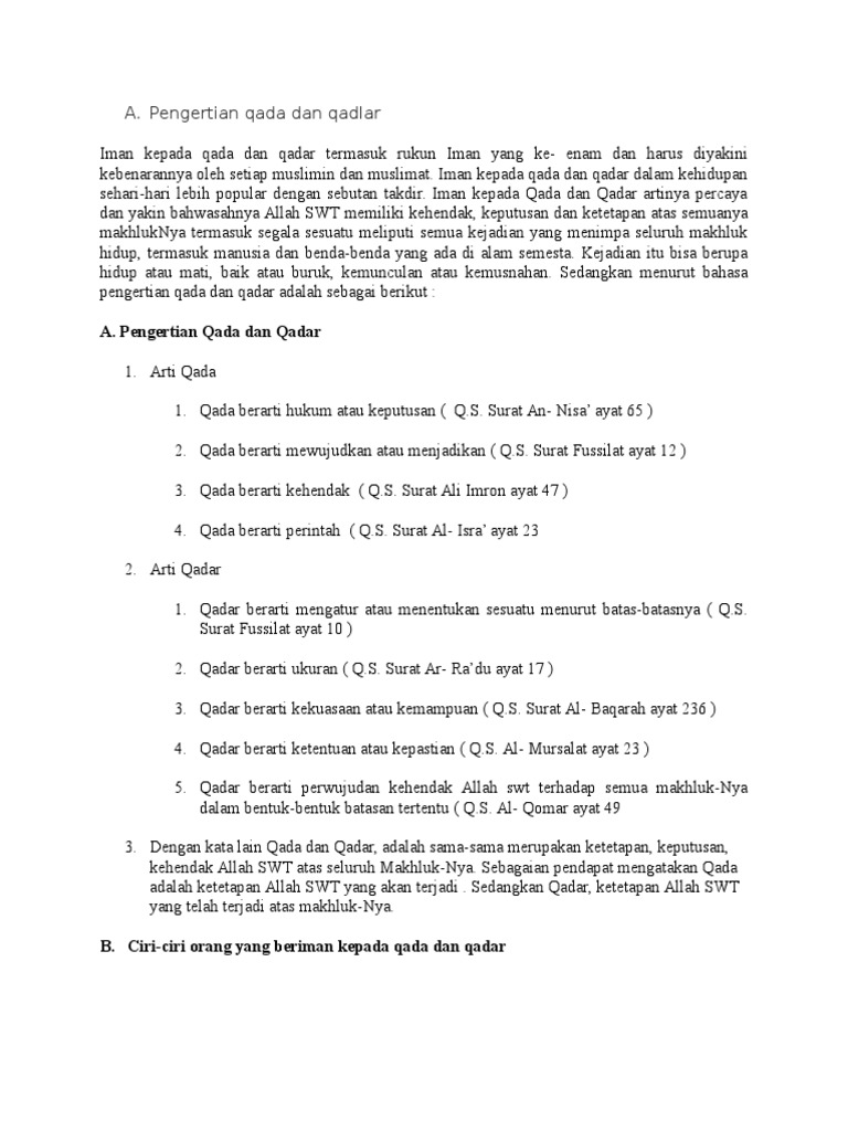 Qada dalam bahasa artinya adalah hukum, ketetapan, perintah atau kehendak. Qadar menurut istilah adalah mengadakan sesuatu menurut ukuran dan cara yang dikehendaki allah swt. Jadi, pengertian iman kepada qadha dan qodar adalah menyakini dengan sepenuh hati adanya ketentuan allah swt yang berlaku bagi semua mahluk hidup. Pengertian qadha dan qadar menurut bahasa qadha memiliki beberapa arti yaitu hukum, ketetapan, perintah, kehendak, pemberitahuan, dan penciptaan. Jika ia telah terbit dari barat dan semua umat manusia melihatnya, mereka menjadi beriman semuanya.